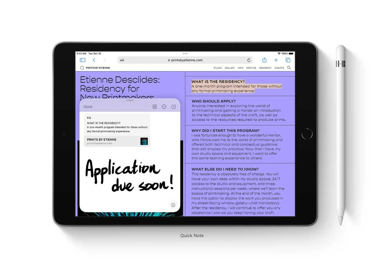 Quick Note is a fast and easy way to make or get to a note no matter what you’re doing. Start a Quick Note with a swipe of a finger or Apple Pencil, then jot down information over any app or screen. Add links, highlights, tags, and mentions for context.