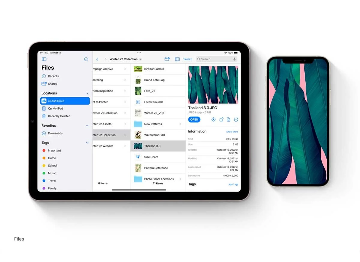 You can organize, share, and get to all your stuff with the Files app. Manage what’s on your iPad, in iCloud, or on cloud services like Box. Easily access files stored on a thumb drive or other external devices, too.